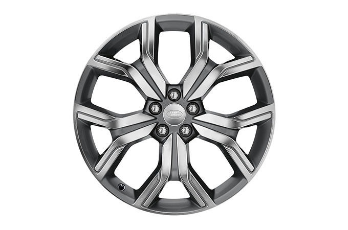 Range Rover Evoque Autobiography është e pajisur me rrota aliazhi 20” me pesë këmbë “Stili 527” me prerje diamanti dhe shtresë kontrasti ngjyrë argjendi.